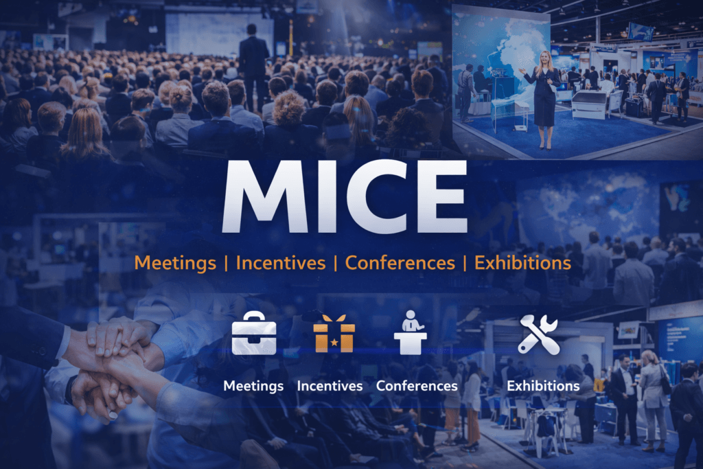 MICE stands for Meetings, Incentives, Conferences, and Exhibitions — a specialized segment of corporate travel and event management focused on organized business events.